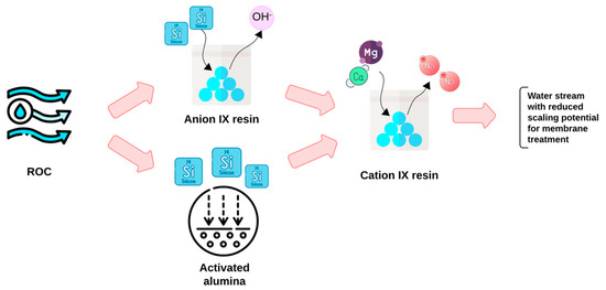 The ROC treatment strategies mentioned above require appropriate pretreatment to reduce scaling and facilitate resource recovery. A literature review has identified technologies with high selectivity for removing hardness and silica, such as ion exchange (IX) and activated alumina (AA), as promising alternative approaches (Table 1). These methods provide several advantages, including no chemical addition during treatment, no pH adjustment required, no sludge generation, and regenerability of the media [36].