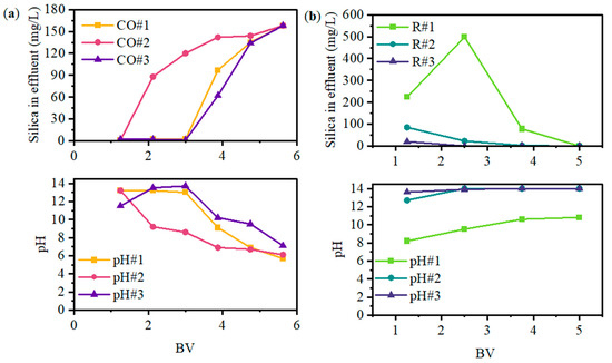 The results for three service cycles (#1, #2, and #3) are shown in Figure 3, where CO and R stand for column operation and regeneration, respectively. Silica breakthrough was measured after three bed volumes (BVs) for CO #1 and #2, with full resin saturation after five BVs. However, CO#3 showed a silica breakthrough after 1 BV.