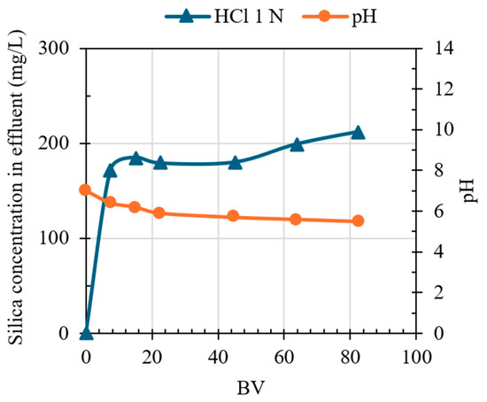 The ionic form of SRIX-2 was initially changed from Cl− to OH− using a 1 M NaOH solution, therefore the pH of ROC that was previously adjusted to 4.5 increased to ~10–13 during the first two BVs of the CO. However, the pH quickly decreased to ~7 at BV 5; this could suggest that the change of the resin’s ionic form to OH− was not fully achieved. Figure 3a shows that silica removal declined as the pH decreased. Silicic acid (H3SiO4−) has a pKa of 9.84; therefore, at pH < 9, the dominant silica specie in water is orthosilicic acid (Si(OH)4), which is a neutral compound that does not participate in the ion exchange process [39,53]. In the past, silica removal using SBA resins has also been reported to be affected by the competition of other ions in water, like SO42− and Cl− [41,58], which have high concentrations in ROC (Table 2).
