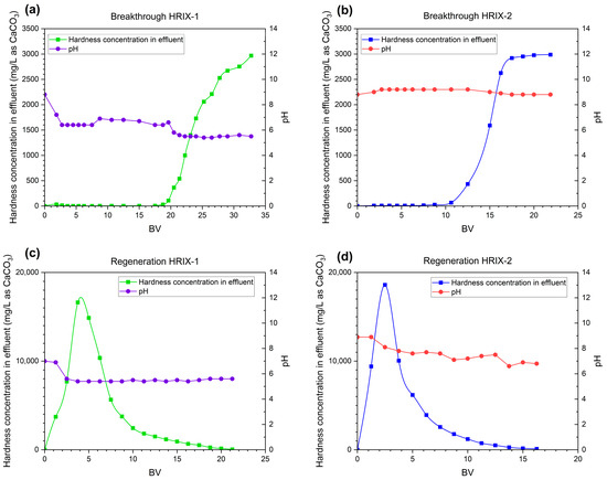 In terms of pH stability, HRIX-2 maintained a slightly basic pH without high variability. In contrast, HRIX-1 showed slightly acidic pH values, which may be attributed to the incomplete preconditioning of its ionic form from H+ to Na+. Regarding regeneration, columns using HRIX-1 and HRIX-2 were fully regenerated after 20 and 17 BV, respectively, as shown in Figure 6c,d. Consequently, the chemical requirements are 20 and 17 L of 8% NaCl/L of resin and the regeneration BV/saturation BV ratios are 0.6 and 1. These ratio values, particularly for HRIX-2, are far above levels considered practical in industrial applications, underscoring the challenges of using SAC IX for brine treatment.