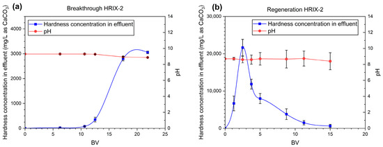 The results in Figure 7 show the averages for three service cycles using HRIX-2. Figure 7a shows the hardness breakthrough started after 10 BV, and the resin was fully saturated after 17 BV, which is consistent with Figure 6b. The total capacity of the resin was 65.63 g CaCO3/L resin when it was completely saturated. The regeneration curve (Figure 7b) showed more variability between cycles, with a complete regeneration after 15 BV.