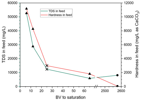 Summative comparison of BV to column saturation as a function of TDS and hardness reported in the literature (Table 1). (▲) Data from [49]; (✕) average data of the HRIX-1 and HRIX-2 performance in this study; (●) average data of the column operation of three different WACs [47].