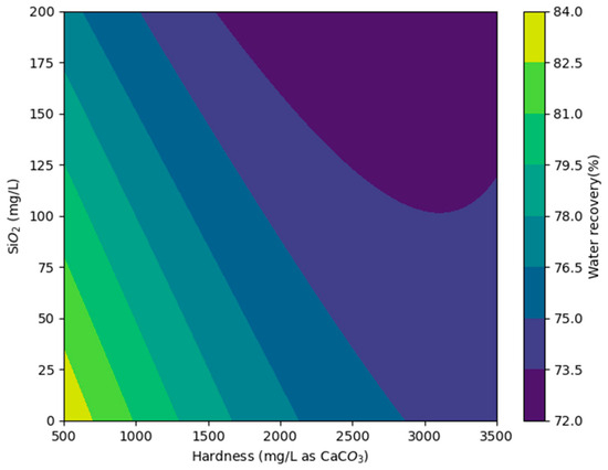 The maximum water recovery using Vitec 7400 was used to develop the empirical model (Equation (7)). Analysis of water recovery at different silica and hardness concentrations (Figure 9) suggests that reducing hardness below 1000 mg/L (as CaCO3) can further enhance ROC recovery. Additionally, a silica concentration below 50 mg/L was identified as the optimal condition for maximum water recovery. A notable decrease in water recovery was observed when hardness exceeded 2500 mg/L (as CaCO3) and silica exceeded 150 mg/L, indicating that ROC recovery efficiency is significantly (~9%) compromised beyond these thresholds.