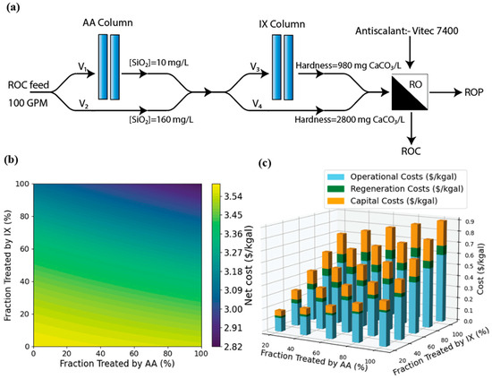 Using the available empirical water recovery model, a water treatment cost estimation (SM, Table S3) was performed by blending ROC, AA effluent, and IX effluent waters at different compositions (Figure 10a). The ROC feed water entered the system at a flow rate of 100 GPM (378.5 L per minute), resulting in a treatment capacity of 0.144 MGD. For this analysis, the silica concentration in the AA effluent was set at 10 mg/L, and the hardness of the IX effluent was assumed to be 980 mg/L as CaCO3.