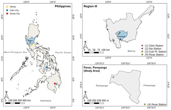 The research site denoted by the Porac station on the map was geographically located at Porac, Pampanga, Philippines (15.107492 N and 120.507642 E), with an elevation of 79 m above sea level, and an area of 24-hectares (Figure 1). Porac, Pampanga was located roughly 76 km north of Manila in the Central Luzon region of the Philippines. The elevation in Pampanga spans from 3 m below sea level as the lowest point to 1408 m above sea level as the highest point. Agriculture serves as the main source of livelihood for residents in the area as the province is known for its agricultural productivity, specifically in farming, fishing, and agro-industrial activities.