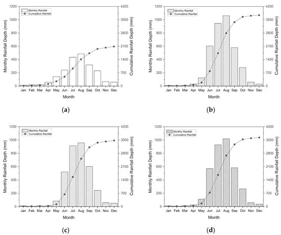 After acquiring the distances and rainfall amounts for each location, the new point rainfall was calculated using the IDW method, where Pnew represents the new point rainfall, Pn denotes the daily rainfall amount at station n, and dn indicates the distance from station n to the study site. The newly recorded daily point rainfall was subsequently processed, yielding the total and average monthly rainfall quantities for the research location (Equation (2)).
