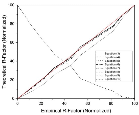 From the analysis of each rainfall erosivity factor, Figure 3 presents a theoretical vs. empirical normalized plot that compares the results obtained from the eight tested existing R-factor equations with the equation developed for the study. The data presented in Figure 3 showed that the Equations (3)–(7) and (10) have similar normalized values compared to the generated equation. A certain degree of accuracy and dependability with these predictions can be assumed from the close match of the normalized values between these equations and the developed equation.