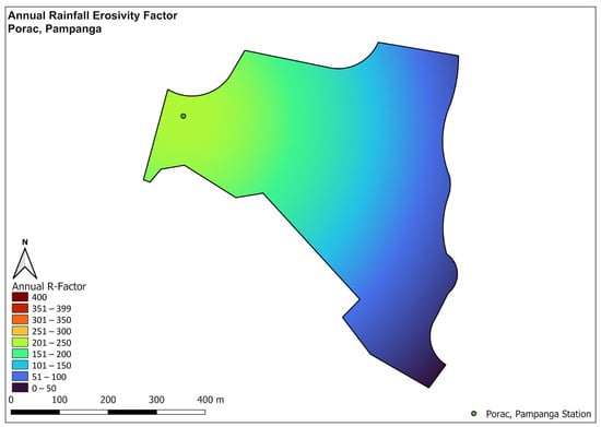 A study conducted by Adediji et al. [] applied the Roose equation for their assessment conducted in Nigeria. From the evaluation, the rainfall amounts recorded in the area were significantly higher, with R-factor estimates that spanned from 270 MJ/ha mm/h to 450 MJ/ha mm/h with average annual rainfall amounts of 600 mm to 1000 mm. Singh’s formula was applied in a study conducted in India by Vinay and Mahalingam [], which quantified soil erosion by water. It was found from the study that the R-factor, when utilizing the developed formula of Singh, presented estimates of 257.7 MJ/ha mm/h to 364.9 MJ/ha mm/h with recorded average annual rainfall from 500 mm to 700 mm. The values obtained in both studies validate the estimates gathered for the Porac station, as varying extreme rainfall events caused the difference in estimates. The significantly higher rainfall amounts observed in both Nigeria and India compared to the Porac station resulted in a more significant impact of rainfall on erosion in the areas.