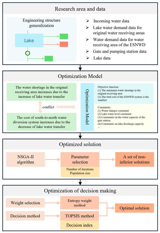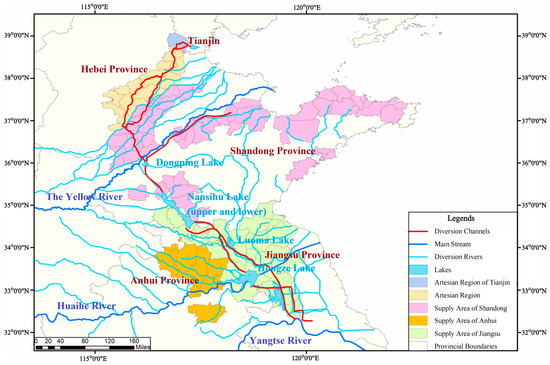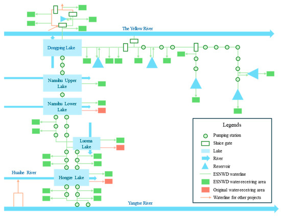Due to the significant difference in precipitation, there is a problem of “more water in the south and less water in the north” in China [1,2]. With the continuous population increase and rapid development of the social economy, the contradiction between the supply and demand of water resources in northern China has become extremely prominent, restricting socioeconomic development and ecological environmental protection [3,4,5]. To address water scarcity in the north, China built the South-to-North Water Diversion (SNWD) Project with eastern, middle, and western routes [6]. The eastern route project diverts water from the lower reaches of the Yangtze River to the north through several lakes and delivers water step-by-step to provinces and cities along the route, effectively easing water resource tension in the Huang-Huai-Hai region of northern China [7]. However, such ultra-long-distance water transfer involves multiple regions, sources, projects, users, and functions, creating significant challenges for the project operation. Therefore, the development of a cross-regional unified water resource scheduling model to provide the necessary decision support for project operation decision-making is urgently required.