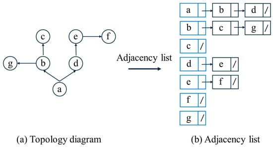 After system generalization and node layout, the system includes a water source project, users, nodes, and other key components. The objects are connected by different topological relations, which form a generalized network diagram for the system. Object topological relationships are divided into the source-sink relationships between nodes and the supply-demand relationships between water sources and users. The topological relations are determined by the hydraulic connections between nodes. If water from node a flows to nodes b and d, the topology diagram points from a to b and d. If node b supplies water to node g, the topology diagram points from b to g. The following shows a relationship between objects based on the system network diagram and is expressed as an adjacency list: If a topological relationship exists, as shown in Figure 4a, the corresponding adjacency list is as shown in Figure 4b. This adjacency list indicates that water from a flows to b and d, water from b flows to c and g, and so on.