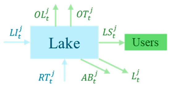 As shown in Figure 5, the inflow to lake j in period t consists of two parts: the local inflow to lake and the amount of water entering the lake from conveyance channel . The outflow consists of five components: local water supply , northward transfer water from lake , other northward transfer water through lake , lake losses , and abandonment .