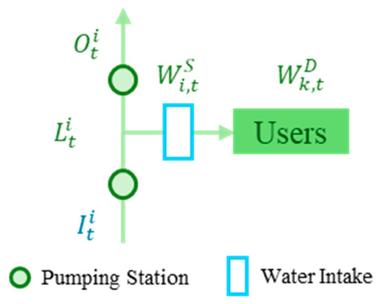 The users of the ESNWD project are the receiving areas divided based on the intake gates. The river intake node was established during the deployment of the node to facilitate the supply to the receiving zone, which is located in the river structure, as shown in Figure 6.