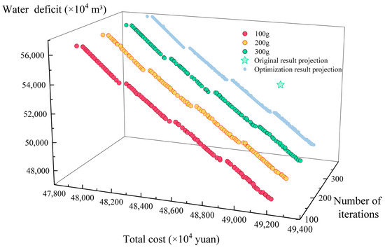 The drier year of 2017, which had a greater water shortage, was selected as the typical year. Using the water transfer levels of Hongze, Luoma, and Nansihu Lower lakes as the decision variables, and minimizing the total system cost and water shortage in the original receiving area of the lakes as the objective functions, the NSGA-II algorithm was used for the optimization of the scheme. The optimized northward water transfer level scheduling results were analyzed and compared with the current scheduling results. The initial population size was set to 100 (100p), the number of subgenerations was 50, the crossover probability is 0.9, the variance probability is dynamically adjusted according to the problem dimensions, and the maximum number of iterations was 100, 200, and 300 generations (100g, 200g, and 300g), respectively. The set of Pareto solutions obtained after the optimization is shown in Figure 8. This shows that the Pareto solution set of the optimized scheme is better than that of the original northward water transfer level scheme for the exact incoming and outgoing water demands but does not produce better results as the number of iterations increases. Consequently, when the number of iterations reaches 100g, the obtained Pareto solution set meets the optimization requirements. Increasing the number of iterations increased the optimization time. However, it did not yield better optimization results; therefore, the subsequent optimization calculations were fixed to use 100g as the number of iterations.