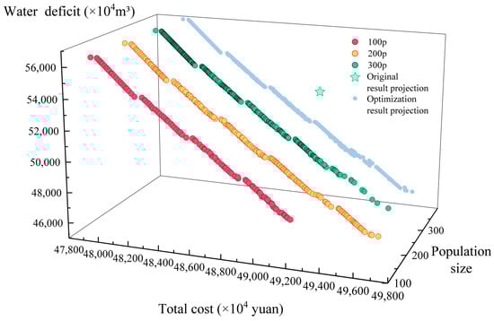 The number of iterations was set to 100, number of children to 50, and initial population sizes to 100, 200, and 300 (100p, 200p, and 300p). The Pareto solution set obtained after the optimization is shown in Figure 9. The difference between the sets of Pareto solutions obtained from different population sizes in the direction of smaller total costs and larger water shortages is not significant. However, compared with 200p and 300p, the 100p solution set discards the optimization results in the direction of larger total costs and smaller water shortages to a certain extent and cannot contain the feasible options more completely or perfectly. In contrast, the 200p and 300p solution sets can be considered to better cover the available options. To analyze the advantages and disadvantages of the Pareto solution sets obtained with different population sizes and select the appropriate optimal population sizes, solution sets with all three initial population sizes were used for decision optimization.