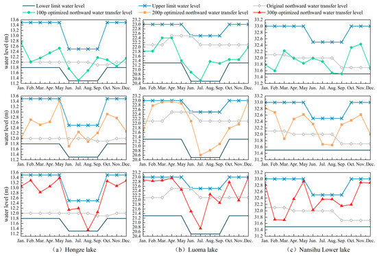 The results of the optimized scheduling of the northward water transfer level for the three different population sizes compared with the original scheduling results are shown in Table 4. The northward water transfer level lines of Hongze, Luoma, and Nansihu Lower lakes before and after optimization are shown in Figure 10.