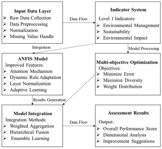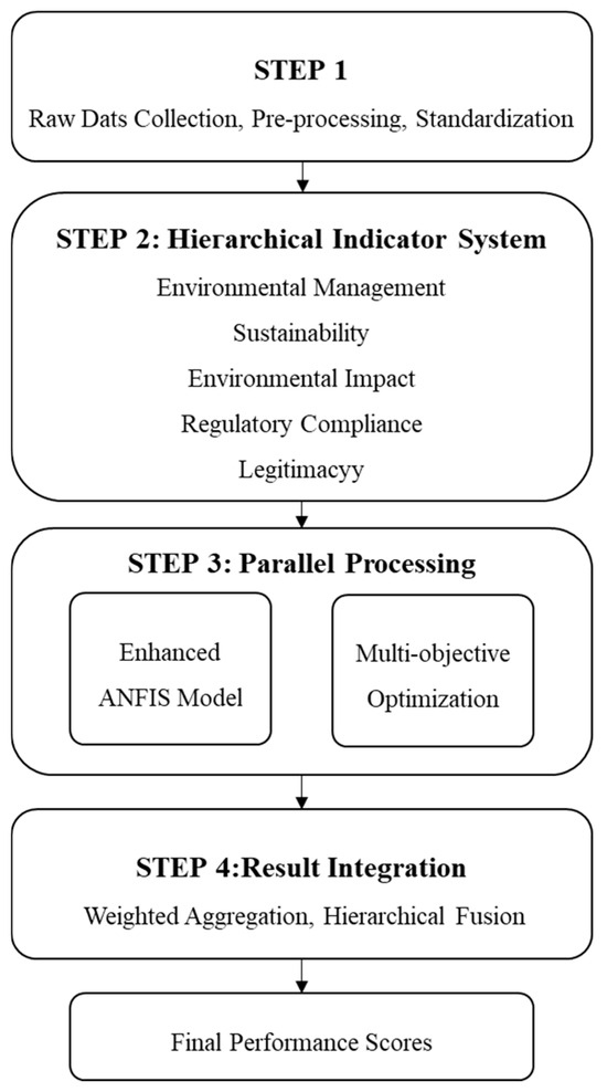 The evaluation framework process for the environmental performance of water infrastructure includes four key steps. First, raw data are collected, pre-processed, and standardized. Second, a hierarchical indicator system is constructed, encompassing environmental management, sustainability, environmental impact, regulatory compliance, and legitimacy. Third, the enhanced ANFIS model and the multi-objective optimization method operate in parallel, aiming to refine indicator selection and weight assignment. Finally, weighted aggregation and hierarchical fusion techniques integrate both sets of results, yielding final performance scores and dimension-specific analyses. By leveraging advanced artificial intelligence techniques, this integrated framework ensures scientific rigor, comprehensiveness, and enhanced accuracy in environmental performance assessment.