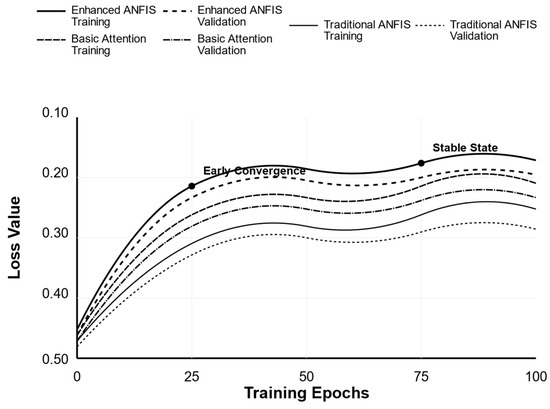 Figure 6 visually demonstrates the comprehensive advantages of the enhanced ANFIS model in terms of convergence speed, stability, and final performance outcomes. Among the three models, enhanced ANFIS reaches a relatively low loss value (approximately 0.20) after about 25 epochs and stabilizes between 0.155 and 0.180 after 75 epochs. The minimal gap between training and validation losses suggests robust generalization capabilities. In comparison, the basic attention model’s performance falls between that of enhanced ANFIS and traditional ANFIS. Although its convergence is quicker than that of traditional ANFIS, it remains slower than enhanced ANFIS. Its final training loss stabilizes around 0.195, while the validation loss settles near 0.220. Traditional ANFIS exhibits the slowest convergence rate and the highest overall loss values, with a final training loss of 0.240 and a validation loss of 0.275. Moreover, it displays the greatest fluctuation during training, indicating inadequate stability. These results collectively highlight the clear performance hierarchy, with enhanced ANFIS consistently outperforming the other two models.