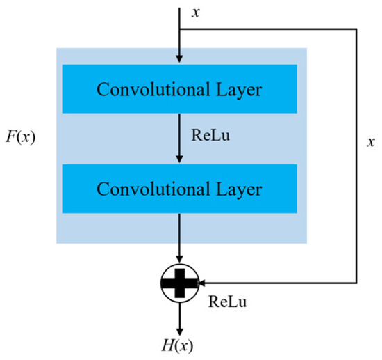 ResNet enhances traditional deep neural networks by introducing residual blocks, thereby simplifying network complexity and addressing the problem of network degradation. The use of residual blocks enables the training of highly effective deep networks, allowing inputs to propagate more swiftly through the identity mappings within the blocks [27]. The structure of a residual block is depicted in Figure 3, where x represents the input and H(x) denotes the output. The residual F(x) indicates the error between H(x) and x as , with the direct pathway from input to output referred to as the shortcut connection [28].