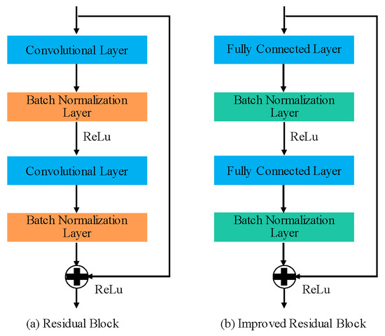 To address the challenges associated with mine water inrush forecasting, we propose several modifications to the residual structure of ResNet: specifically, substituting the convolutional and pooling layers within the residual blocks with fully connected layers. This alteration is anticipated to enhance the extraction of features pertinent to time series data. Figure 4a illustrates the conventional residual block in the ResNet architecture, while the enhanced structure of the residual block is depicted in Figure 4b. The inclusion of batch normalization layers within the residual framework serves a dual purpose: it acts as a pooling mechanism and simplifies the network’s architecture, thereby enabling the application of higher learning rates during training, ultimately reducing computational requirements.