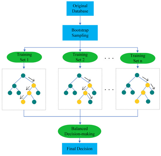 Random Forest (RF) represents an ensemble learning algorithm that leverages decision trees as fundamental classifiers. Its workflow entails three crucial steps: bootstrap resampling, construction of decision tree base classifiers, and voting, as visually depicted in Figure 5. The “random” element within the RF algorithm manifests through the amalgamation of two key concepts: bootstrap sampling and random subspace [30]. Initially, the bootstrap method is employed to stochastically extract samples with replacement from the original dataset, thereby composing a sub-training set of equivalent capacity. Subsequently, a specified number of feature subsets are randomly selected from the entire pool of feature attributes, with the optimal split attribute being chosen to establish a decision tree node. This “random” process is iteratively performed N times, resulting in the creation of N decision trees that are seamlessly interconnected to form a forest. Ultimately, when presented with a test sample set, each decision tree within the forest participates in a voting scheme, wherein the decision receiving the highest number of votes is deemed the definitive outcome, as articulated in Equation (8) [31].