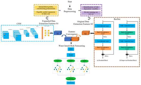 In this study, we have developed a data-driven predictive model for assessing water inrush risks by integrating bicubic interpolation with a CNN-ResNet framework. The model construction involves several key steps, as shown in Figure 6: