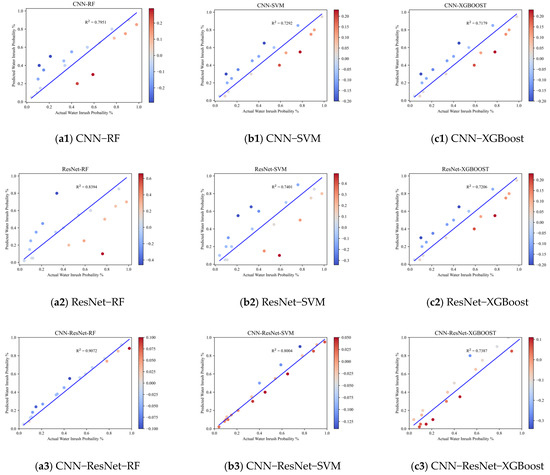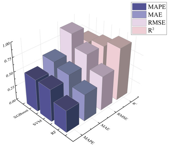 Utilizing the optimally performing S3 reconstructed features as the input set, we employed bicubic interpolation for data augmentation to extensively extract valuable information, thereby testing the predictive performance of the proposed model. The RF model served as the primary model, while XGBoost and SVM were included for comparison. Through the visualization of the models’ performance across various predictive metrics, we provided a clear comparison of model efficacy. The CNN-ResNet-RF model demonstrated superior performance across all metrics, particularly noted by its R2 value approaching 1, indicating a strong capability in explaining the variability within the data. Furthermore, it exhibited relatively low values for MAE, MAPE, and RMSE, signifying minimal prediction error. This model clearly outperformed the others in terms of predictive accuracy, showcasing an enhanced ability to fit the observed data’s changing trends and reflecting exceptional predictive capability and stability. Figure 7 illustrates the performance metrics of each model, revealing that the CNN-ResNet-RF model, augmented by data expansion, reduced MAE compared to SVM and XGBoost by 36.54% and 50.11%, respectively; it also lowered MAPE by 45.49% and 44.18%, and RMSE by 37.10% and 71.24%. These results underscore that the incorporation of data augmentation through composite models not only facilitates the self-mining of associative information within the data but also significantly improves sample distribution and diversity. Consequently, this methodological enhancement contributes to the accuracy and effectiveness of water inrush risk predictions.