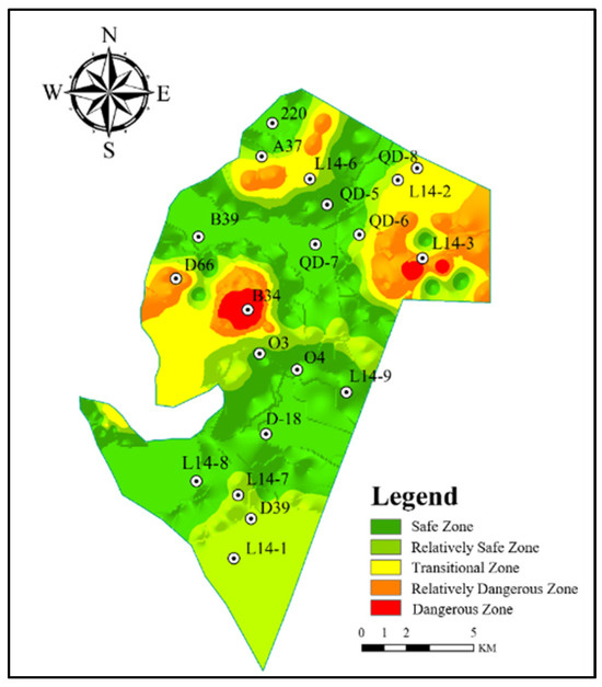 The drilling data from the Yangcun Coal Mine, consisting of 20 sets of measurements across eight dimensions, was utilized as a validation dataset for the trained CNN-ResNet-RF model. This model predicted the probability of water inrush, which was subsequently integrated into a GIS. Using the Kriging interpolation method, we derived a comprehensive probability distribution of water inrush across the entire mining area. The water inrush risk levels were categorized into five safety classifications—safe zone, relatively safe zone, transitional zone, relatively dangerous zone, and dangerous zone—using the natural breaks method, with the assessments visually represented through color variation. Figure 9 indicates that the dangerous zone includes drilling points L14-3 and B34, whereas the moderately dangerous zone comprises the D66 drilling point. The transitional zone encompasses drilling points L14-2, L14-6, QD-6, and QD-8. The northern section of the mining area consists of transitional, moderately dangerous, and dangerous zones, in contrast to the southern section, which is primarily made up of relatively safe and safe zones. The most critical risk areas are predominantly located in the northeastern part of the mining area, reflecting a consistent trend of increasing danger from south to north.