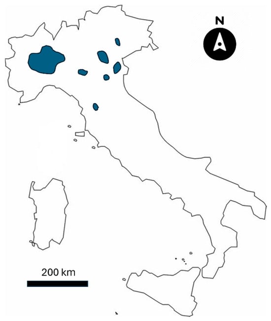 Distribution (blue color) of the main rice-producing areas in Italy.