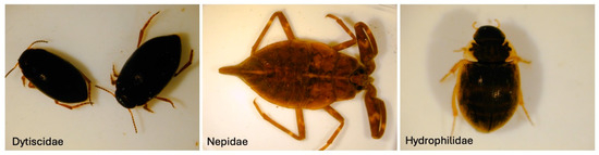 Water beetles (order: Coleoptera) are a characteristic group inhabiting lentic and semi-lentic environments (ponds, oxbow lakes, marshes, abandoned meanders) and have found in rice fields a perfect surrogate for what had been their natural habitats in the Po floodplains. Among these, the Dytiscidae family stands out for its richness and diversity. These beetles colonize rice fields in both their larval and adult stages and serve as apex predators in these often-fishless environments, e.g., [30,38,39,40]. Among Dytiscidae, Hydrogliphagus geminus has been documented as an early colonizer of rice fields, and has been shown to be an effective controller of mosquito larvae [30]. Interestingly, a faunistic note on the distribution of Noteridae in southern Piedmont reports that rice fields are among the few habitats where these organisms are common and abundant [41]. Species from the family Hydrophilidae are also listed in these habitats, with the recurrent presence of Hydrous piceus, the largest beetle in Europe [17,42]. Apart from these predaceous groups, other strictly aquatic families can be found in paddy fields: Elmidae, Dryopidae, Helophoridae, Limnebiidae. Furthermore, Chrysomelidae Donacinae are occasionally found in northern Italian rice fields [43,44,45]. From another perspective, Curculionidae and Erirhinidae are groups of growing importance in Italian rice fields, because of the arrival of the invasive Sitophilus oryzae and Lissorhoptrus oryzophilus [46,47], which represents a serious agricultural problem and requires dedicated and continuous management.
