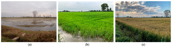 Different phases of the agricultural cycle in rice fields, depicting (a) winter flooding, (b) spring low-level maintenance and (c) late summer pre-cutting drought.