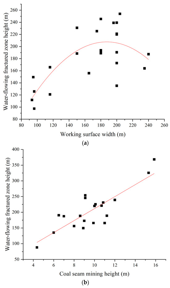 Relationship diagram between water-conducting fracture zone height and working face width h of coal seam mining height. (a) Relationship between water-conducting fracture zone height and working face width. (b) Relationship between water-conducting fracture zone height and coal seam mining height.
