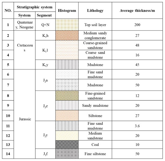 The geology and hydrogeological conditions (Figure 2) of each wellfield in the Yonglong mining area are similar, but they are unique compared with other coalfields. The main characteristics include the following: The main mining is the Jurassic Yan’an Formation coal seam, and the main aquifer is the Cretaceous Luohe River. The formation sandstone aquifer, the lithology of the strata between the coal seam and the Luohe Formation, is mainly mudstone, sandstone, and conglomerate; the Luohe Formation is extremely thick, with a thickness of more than 100 m and a maximum thickness of 550 m. The water-richness of the Luohe Formation varies greatly; the coal seams are extremely thick, with a thickness of more than 10 m and a maximum thickness of 20~30 m. The coal seams are buried deep and vary greatly, about 300~1000 m. It is precisely this specific geological and hydrogeological condition that determines that the height of the water-flowing fractured zone in the roof of the fully mechanized caving coal mining in the Yonglong mining area, which has a special law different from other mining areas.