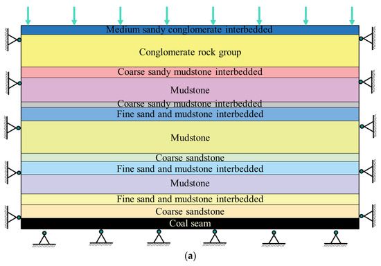 The numerical simulation was established by selecting the same research background and engineering profile as the similar simulation. The top of the model was used as a free boundary, the left, right, and bottom boundaries were used as single constraint boundaries with zero displacement, and a vertical load of 10 MPa was applied to the top boundary. The rock strata follow the Mohr–Coulomb failure law, and the block connection joints in the model adopt an elastic-plastic contact surface model with Coulomb slip failure properties. The single step distance of the mining process was 40 m, and the mining distance of 400 m was completed in 10 rounds. The layout of the displacement measurement line was based on arranging a measurement point every 40 m above the coal seam, with each measurement point 10 m apart, for a total of 40 measurement points. The final model layer thickness and rock mechanic parameters can be found in Table 4.