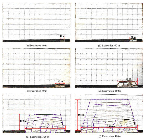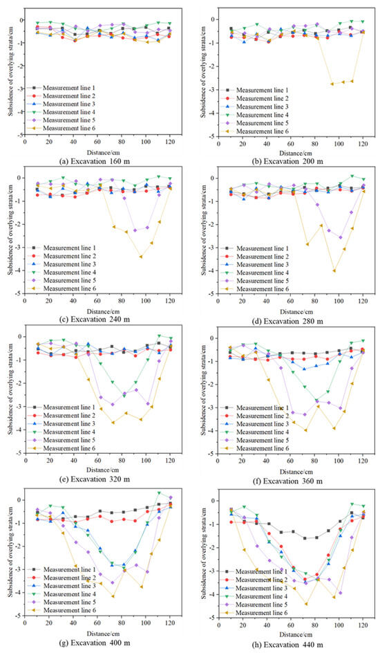 Figure 8 shows the dynamic evolution of the subsidence of the overlying strata during the advancement of the working face. It can be seen that when the working face was advanced to 160 m, the rock layer where survey line 6 was located did not undergo obvious deformation, which shows that the rock layer was hard and had good integrity. However, when the working face was advanced to 200 m, the roof of the coal seam at a height of 10 cm (survey line 6, corresponding to the roof of 30 m) began to sink (Figure 6), with a maximum sinking of about 1.13 cm (4.52 m); part of the low-level roof below it collapsed, and transverse cracks and tiny bed separation appeared in the direct roof, and the movement and deformation of the rock layers where other survey lines were located above it were not obvious. As the working face continued to advance, the subsidence of the rock layer where survey line 6 was located continued to increase. When it was advanced to 320 m, the subsidence, bed separation, and fracture of the rock layer had spread to survey lines 4, 5, and 6. The subsidence of the rock layer at the height of survey line 6 was the largest, about 3.5 cm (10.5 m). At this time, in the rock layer above the coal seam, the longitudinal cracks rapidly expanded upward along the fault line near the opening eye. At the same time, the rock layer above the coal seam showed obvious stratification. Finally, when the working face continued to advance to 440 m, the rock layer where each survey line was located reached the maximum subsidence value within 60–100 cm from the cut hole, and, at this time, the range was 40 cm away from the working face.