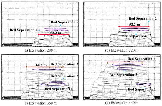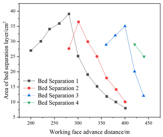 During the bed-separation analysis process, four significant separation layers were selected for analysis of separation layer area changes (Figure 10). When the working face was excavated to 200 m, as the overlying rock layer collapsed, separation layer 1 appeared at this time, and the lateral length of bed separation 1 is 32 cm, the maximum depth is 4 cm, and the area of the bed separation is 28 cm2. As the working surface continues to advance, the area of bed separation 1 continues to increase, and the lateral length of the bed separation continues to grow. When the excavation reaches 280 m, it reaches the maximum value, the maximum length reaches 52.2 cm, which is equivalent to the actual mining of 208.8 m, and the bed-separation area reaches the maximum 39 cm2. At the same time, separation layer 2 begins to appear. Two separation layers appear in the same rock layer. Layer 2 is only 3 cm away from bed separation 1, and the length of newly formed separation layer 2 reaches 48 cm. With the emergence of bed separation 2, bed separation 1 is gradually compacted, and the area becomes smaller. When the working face advances to 350 m, separation layer No. 3 appears. Bed separation 1 and bed separation 2 continue to be compacted, and the bed separation is compacted into a long and narrow crack. When the working face advances to 400 m, bed separation 3 develops to its maximum. The maximum value is 35.6 cm2, which is smaller than the maximum values of separation layer 1 and separation layer 2. When the working face was mined to 420 m, the No. 4 detachment layer was generated, and the No. 3 detachment layer was rapidly compacted. At this time, the upper surface of the model began to sink. After the working face advanced to 440 m, the upper surface of the model continued to sink slowly, and the upper surface of the model continued to sink slowly. The rock layers are all compacted to varying degrees, and all separation layers continue to become smaller. The No. 1 separation layer increases rapidly due to the sudden subsidence of the underlying rock layer. This may be due to the overflow of fine particles and debris from the model during the compaction process of the model. The sudden subsidence of the underlying rock strata is caused by the external force.