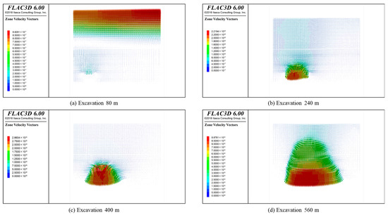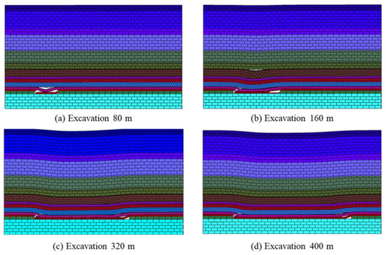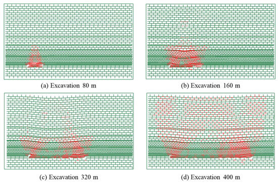 Figure 11 and Figure 12 are the numerical model coal seam mining overburden collapse diagram and fracture development diagram, respectively. It can be seen from the figure that when the model is mined to 80 m, the coal seam direct top collapses, and a narrow stratum is formed at this time, and the stratum is located in the collapse zone. When the working face advances to 120 m, the stratum appears at a high level, the stratum at the low level is compacted, and the water-flowing fractured zone develops into the fracture zone. At this time, the stratum and the fracture are connected. When the working face is mined to about 220 m, the connected water-conducting fractures have developed to the middle and upper part of the Anding Formation, that is, 208 m above the coal seam roof, and the fracture-mining ratio is about 19.54. At this time, the stratum in the middle part of the model is compacted, and the narrow stratum in the coal wall support area on both sides of the model still exists, mainly in the form of longitudinal fractures. As the working face continues to advance, the stratum in the lower part of the Zhiluo Formation in the direction of the goaf gradually moves toward the mining direction, the stratum space begins to close, and the subsidence of the stratum above the goaf continues to intensify, reaching about 7 m. When the working face was advanced to about 340 m, the separation layer and water-flowing fractured zone were basically closed, the subsidence of the overburden rock had reached about 12 m, and the upper part of the goaf had undergone obvious deformation and damage. When the working face was advanced to about 360 m, the deformation and damage of the upper part of the goaf further expanded, the subsidence of the Anding Formation and Yijun Formation strata had reached more than 15 m, and the upper rock strata of the goaf had completely collapsed.