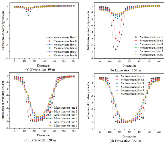 Figure 13 shows the amount of overburden subsidence in coal seam mining in numerical simulation. It can be seen from the figure that the numerical simulation results are basically the same as the results of similar simulation tests. When the working face advances to the first 160 m, the rock layer where survey line 1 is located has not collapsed fully, resulting in a “V”-shaped settlement. When the working face advances to 240 m, the amount of subsidence of survey line 1 increases, and the settlement shape changes from a “V” shape to an irregular “U” shape. When the working face advances to 320 m, the rock layers where survey lines 4, 5, and 6 are located all sink to varying degrees, and the settlement shape of all rock layers changes from a “V” shape to an irregular “U” shape. At this time, the overburden has sunk to create contact with the gangue and enters the compaction stage. When the working face continues to advance to 440 m, the rock layers where each survey line is located reach the maximum subsidence value.