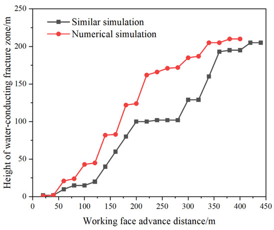 Comparison of water-flowing fractured zone heights between similar simulation and numerical simulation.