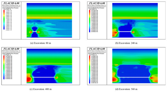Pore water pressure cloud diagram at different mining distances along the strike direction of the working face.