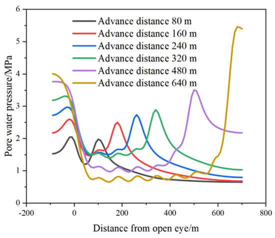 Changes in pore water pressure in the coal seam roof at different advancement distances.