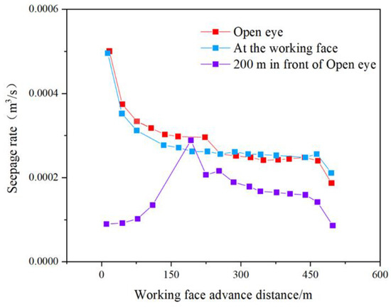 During the bed-separation water inrush process, the seepage velocity will also change with the different stages of the bed separation water inrush event. The change law of the seepage velocity during the bed-separation water inrush process is as follows: before the water inrush, the seepage velocity in the overburden is relatively slow. In the early stage before the water inrush, the seepage velocity is related to the time of the water inrush and the water level. The seepage velocity is slow, and the water level is not high. During the peak of the water inrush, the seepage velocity reaches the highest peak because the cracks in the overburden become larger and the water flow route becomes straighter, resulting in a significant increase in the seepage velocity.