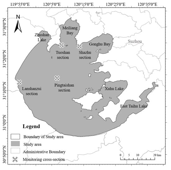 Taihu Lake (30°55’40″–31°32’58″ N, 119°52’32”–120°36’10″ E) is the third largest freshwater lake in China and an important source of drinking water and fishery resources in the Yangtze River Delta region, covering an area of approximately 2427 km2. In recent years, with the increase in social and economic activities and irrational exploitation of lake resources, Taihu Lake is facing serious eutrophication problems, resulting in frequent outbreaks of cyanobacterial blooms, which have had a serious impact on the ecological environment and social economic development of Taihu Lake and its surrounding basins [28]. Since 1998, the total economic losses caused by cyanobacteria blooms in Taihu Lake reached RMB 46.5 billion, accounting for 5.9% of the region’s GDP [29], which has seriously restricted the sustainable development of the regional economy. Currently, Taihu Lake is one of the lakes with the most serious cyanobacteria bloom problem in China and is also one of the eutrophic water bodies that the country focuses on [30].