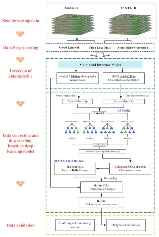 This study used Sentinel-2 MSI and COMS-1 GOCI remote sensing data from the Taihu Lake area from 2019 to 1 May 2024. The two sensors complement each other in terms of temporal and spatial resolution, providing a data basis for downscaling.