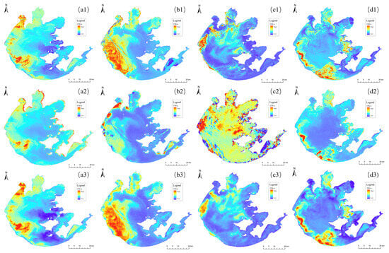 Due to differences in data sources, preprocessing methods, and inversion models, the spatial distribution of the Chl-a concentration data inverted using COMS-1 GOCI and Sentinel-2 MSI exhibited seasonal discrepancies (Figure 3). In spring (Figure 3a) and winter (Figure 3d), the high-value areas of Chl-a were mainly concentrated on the west and south sides of the lake. According to the inversion values of Sentinel-2 MSI and the measured values, the highest concentrations of Chl-a in the high-value areas can reach approximately 30 μg/L and 45 μg/L during spring and winter, respectively, and those in the low-value areas are relatively low, in the range of 0–10 μg/L in both two seasons. The spatial patterns of the COMS-1 GOCI data before correction were roughly correlated with those of Sentinel-2 MSI, which reflected the spatial heterogeneity of Chl-a, but the inversion values were generally high, reaching 550 μg/L at the highest concentration and 17 μg/L at the lowest concentration. The maximum deviation reached 18 times the inversion value of Sentinel-2 under the same conditions. In summer (Figure 3b), Chl-a exhibited proliferation along western zones and spread to the center of the lake, with a maximum concentration of 50–70 μg/L. However, the COMS-1 GOCI Chl-a data before correction did not adequately capture the scope of the large-scale explosion. Instead, it showed extremely high values (approximately 550 μg/L) sporadically on the northwest coast. The overall spatial distribution was poor. The corrected COMS-1 GOCI inversion data (Figure 3(b3)) effectively restored the spatial characteristics of this large-scale explosion. In autumn (Figure 3c), there were occasional high-value areas of Chl-a on the northwest and north coasts, with the highest value in the range of 40–50 μg/L and the average value in the range of 5–10 μg/L. The COMS-1 GOCI data before correction covered almost the entire lake in the high-value area, with the highest reaching 760 μg/L, and even negative values in the low-value area. The corrected inversion data (Figure 3(c3)) solved the problems of disordered spatial distributions and negative values.