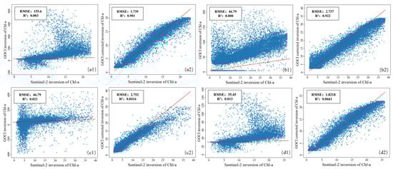 Scatter plot of the fit degree between the corrected and uncorrected COMS-1 GOCI inversion data and Sentinel-2 MSI data. (1, 2) Uncorrected and corrected (unit: μg/L); (a1–d2): spring, summer, autumn, and winter.