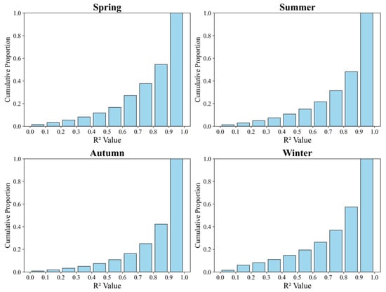 R2 distribution of the fitting trend equation of the daily variation of Chl-a in each season using the RTAD method.