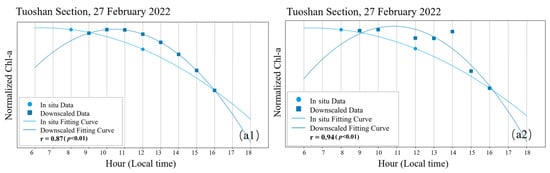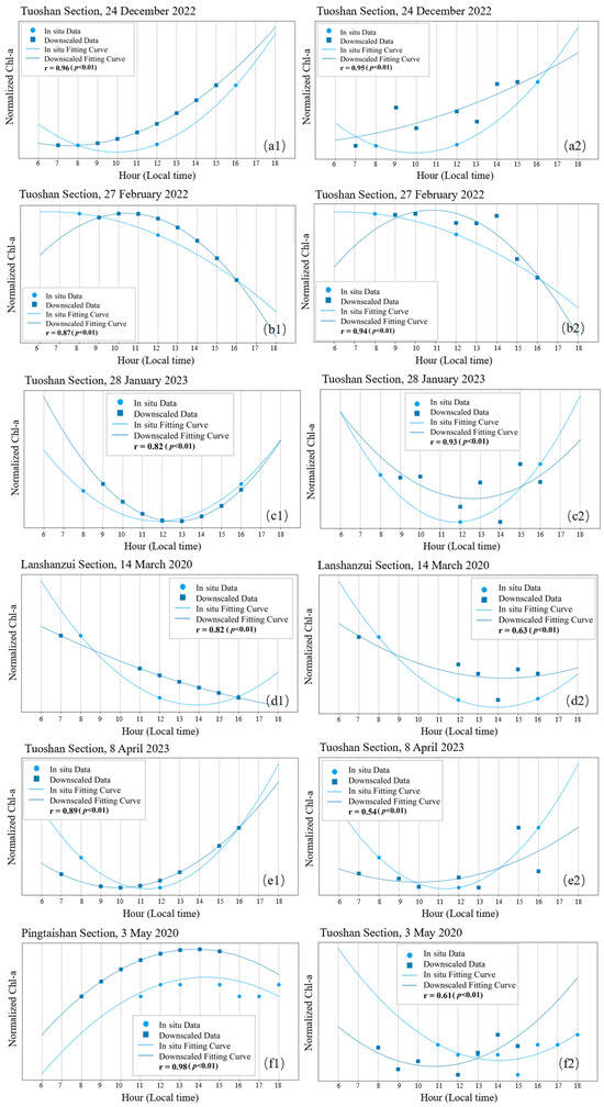Finally, the trend correlation between the two was evaluated. A total of 100 points were sampled at equal intervals within the time range of [6:00, 18:00] Beijing time, and the Pearson correlation coefficient of these points was calculated as the fitting coefficient to evaluate the accuracy of the daily trend of the Chl-a inversion value after downscaling while calculating significance statistics to determine the credibility of the fitting coefficient r:
