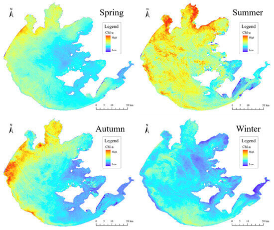 The downscaling model constructed in this study was relatively simple and relied only on the Chl-a inversion results, without involving relevant hydrological and meteorological parameters, which further limited the ability of the model to capture the distribution and changes in Chl-a.