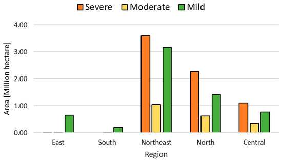 Thailand’s total agricultural area covers about 23.88 million hectares (46.5% of the country) [4], but only 23.6% is irrigated. Farmers in non-irrigated areas regularly face drought. According to the Land Development Department, Ministry of Agriculture, Thailand’s drought severity is classified into three levels, as shown in Figure 1 [5]. Over 80% of drought-affected areas are in northern and northeastern Thailand, which also have the country’s lowest Gross Provincial Product (GPP) [6,7].