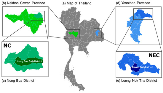 Geographic location of the study areas: (a) Map of Thailand, (b) Nakhon Sawan Province, (c) Nong Bua District, indicating the specific area of Nong Bua Subdistrict where NC is located, (d) Yasothon Province, and (e) Loeng Nok Tha District, indicating the specific area of Sawat Subdistrict where NEC is located. GIS data sourced from the Humanitarian Data Exchange [32].